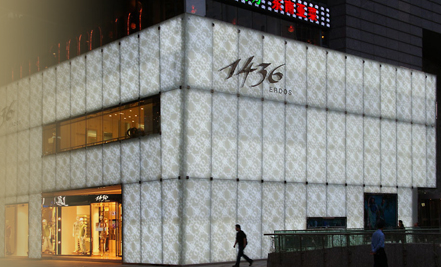 (3)洋为中用:1436 ERDOS,利用鄂尔多斯垄断性的羊绒资源,凭借企业强大的实力,融入西方化的奢侈品产业链之中,并占据一席之地。这是“洋为中用”的路径,其品牌表现已是完全西方的时尚风格,与西方奢侈产业链要件(名设计师、名模、媒体、名流、时尚秀)完全“接轨”。其专卖店外观与LV、GUCCI的风格极为相近。