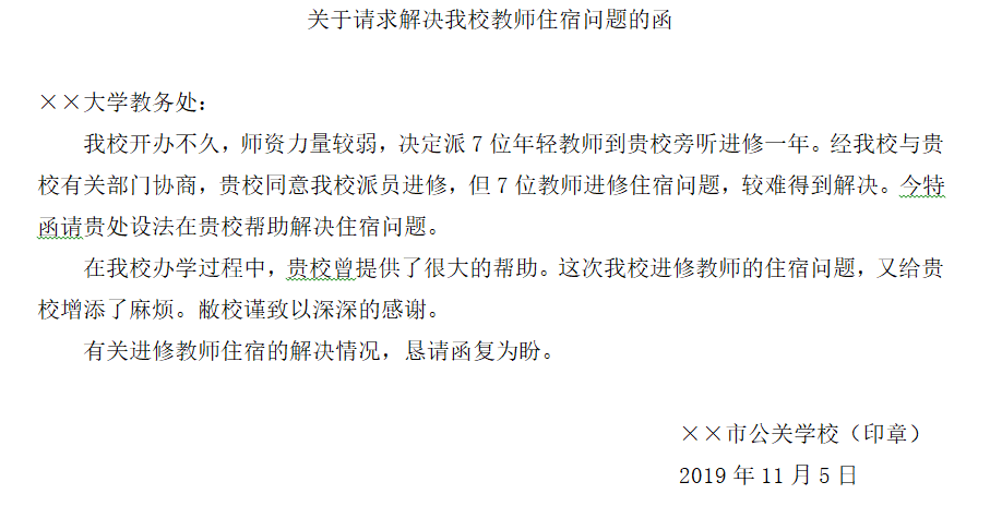 标题与内容不对应。应改为“关于请求解决我校进修教师住宿问题的函”。