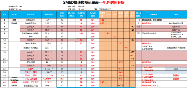 从表3-13中可以看出,其实在操作的过程中,员工还不一定在2个小时内能完成换模作业,根据录像分析得出实际总换模时间为2.3小时。从表中可以看出很多的问题点,比如: