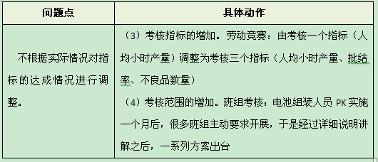 :比如通过劳动竞赛,把考核一个指标(人均小时产量)调整为考核三个指标(人均小时产量、批结率、不良品数量)。