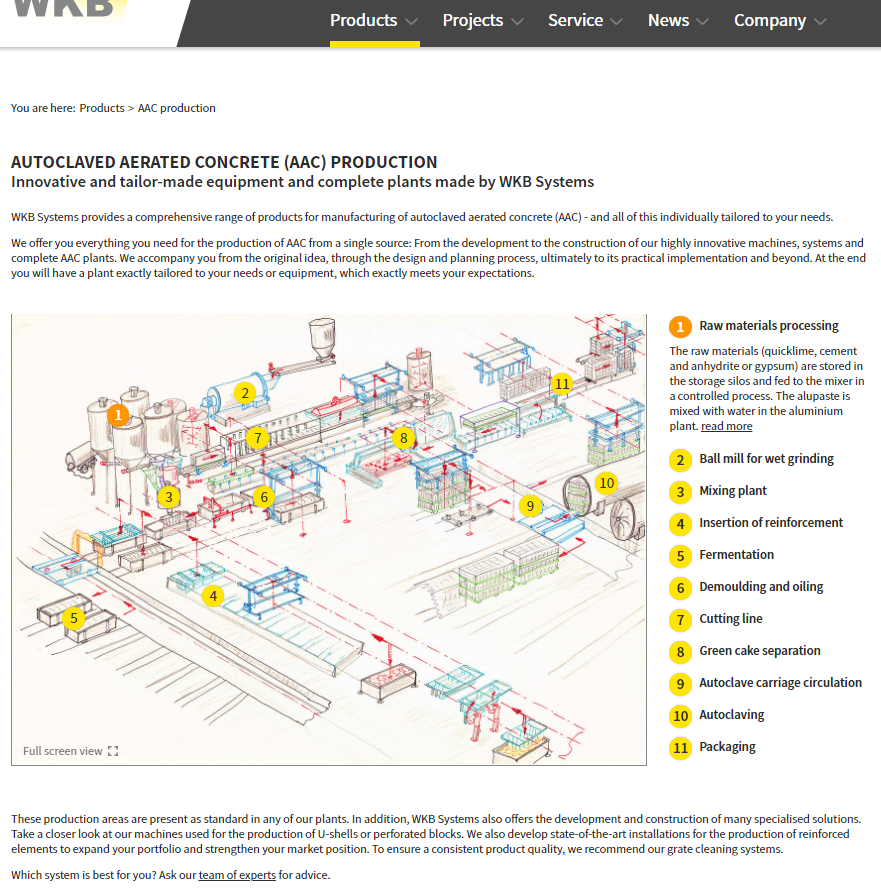 在这一点上,下面这家公司网站的做法就非常值得参考,直接以布局图的形式来展示整条生产线,点击布局图上对应的部分,即显示这个环节的介绍和相关的设备,既方便买家理解单一环节的作用,又使生产线本身的整体性得以贯彻到每一个页面。