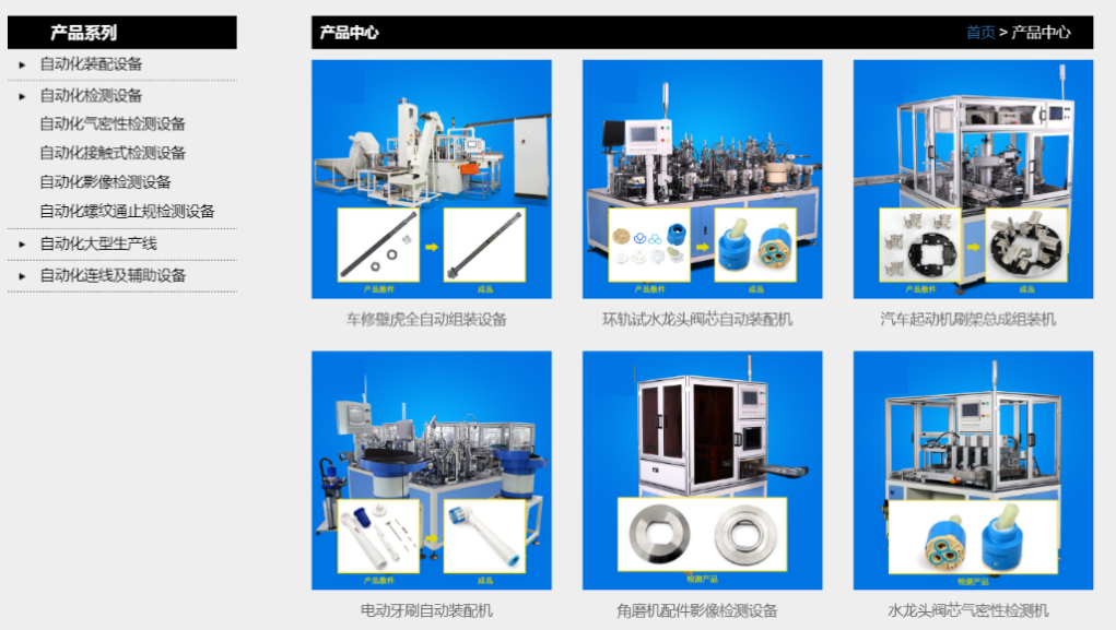 “半定制”的设备意味着标准品与定制服务并存,而且现有型号的标准设备因其设计成熟、生产周期短,往往也在实际业务中占不小的比例。针对这部分设备,依然需要以清晰的思路做分类、并进行详细介绍,要详细到买家可以直接下单;即使是对于那些打算购买定制设备的买家来说,现有设备的介绍内容也是他们重要的参考。这一部分在设计上没有太多特别要考虑的,以标准产品的分类列表来做即可。
