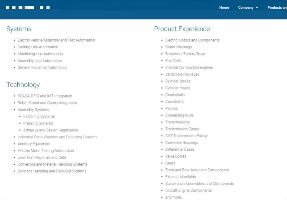 以下是几家国外同行,可以看到他们的架构设计各有风格,但都遵循了这个基本的思路,通过产品主要种类、已做过的案例、技术模块三个角度来向买家表明“我能做什么”。