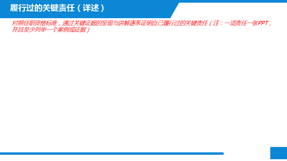参加述职答辩的申请人需在参加述职答辩前2个工作日完成《述职答辩报告PPT》,整理相关证据,并报直接上级进行证据真实性审查通过之后(具体要求参见附件《认证证据整理指南》),提交给认证组织人员。