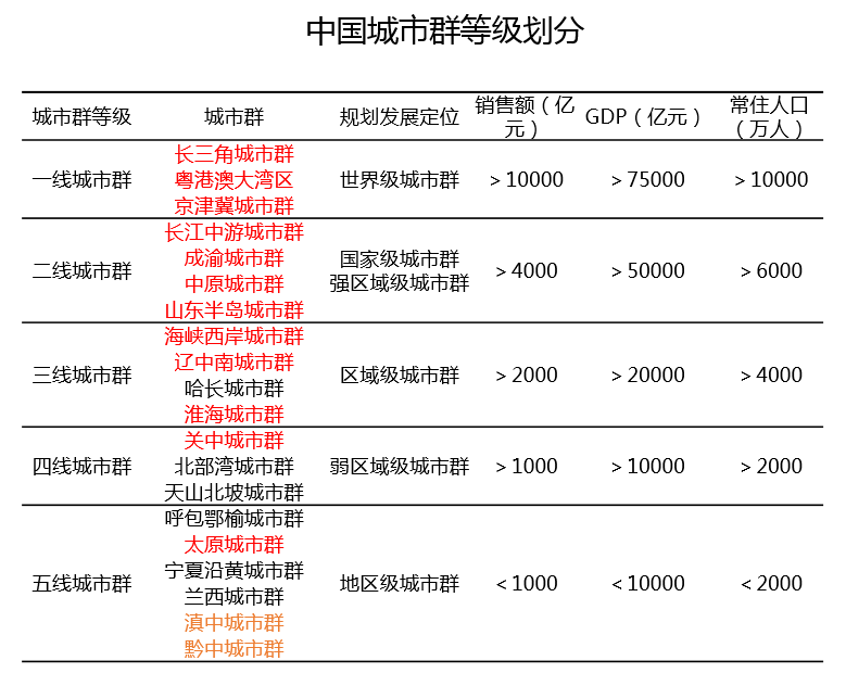 结合国家对城市群的发展定位,以近三年各城市群商品住宅销售额均值为主要参考依据,结合经济、人口等重要宏观指标,将列入国家规划的20个城市群细分为5个等级。