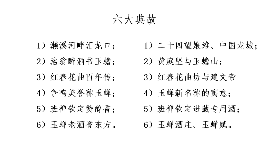 此外,由于玉蝉酒在泸州一向享有盛名,1988年被班禅大师指定为进藏专用酒。如图5-3所示。玉蝉酒的历史悠久、文化底蕴丰富,在此就不一一赘述,用六大典故概括如图5-4所示。