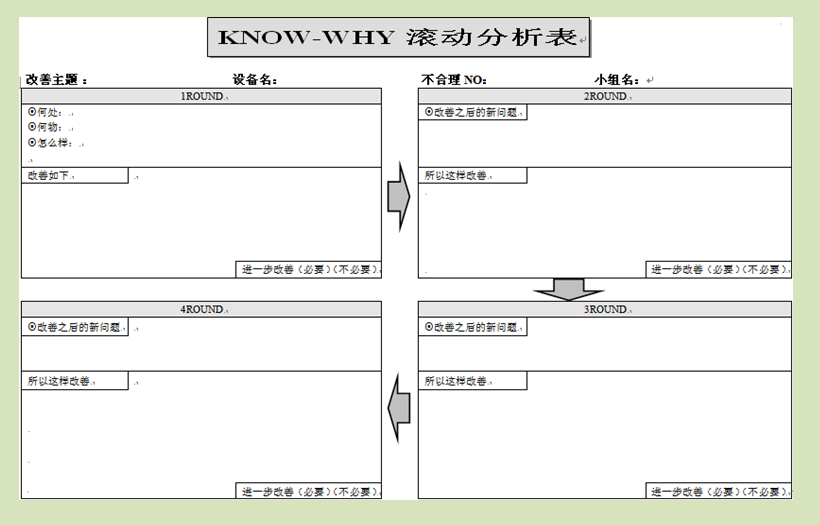 循环改善表(Know-why滚动分析表)是一种追求创意不断累积和持续提升的工具,也称Round改善表。世界上几乎没有一次就能改善到位的完美方法,一般都需要有一次改善、二次改善甚至多次改善的过程。运用这个表,就是要求员工追求卓越,持续改善。表2-11就是Know-why滚动分析表的样式。