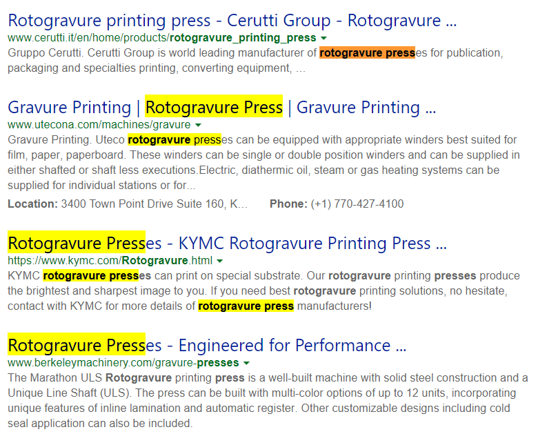 以凹版印刷机(rotogravure press)为例,一个在互联网上相对准确的关键词,应当完全满足以下要求: