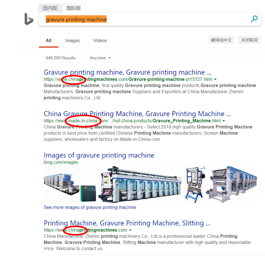 我们应该都知道,目前国内做凹版印刷机落后国外可能都不止十年二十年;对于一个真正想找凹版印刷机的用户而言,Bing应当想尽办法帮他找到国际上做凹版印刷机最好的公司给他看。但是在上面两张图都没有广告信息的情况下,一边全是中国的公司,另一边却没有中国的公司,究竟是什么造成这样的差别?
