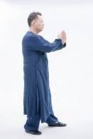 第二个重点,不管是两手相互交叉还是展开再按出,一切小臂的开门关门动作之枢纽都在肘部。以肘部为支点,以根劲为劲源,进行前进后退,开合互换。不要两只手自己动来动去。当后脚踩下去移动重心往前时,两手夹脊吐气而按出,此时脚停手停,手停脚停。一动无有不动,一静无有不静。郑子太极拳三十七式的任何一个动作,都必须符合这个原则。如果说太极基准八法是各派太极的共同准则,那么就郑子太极拳而言,这个“一动无有不动,一静无有不静”就是太极基准第九法。