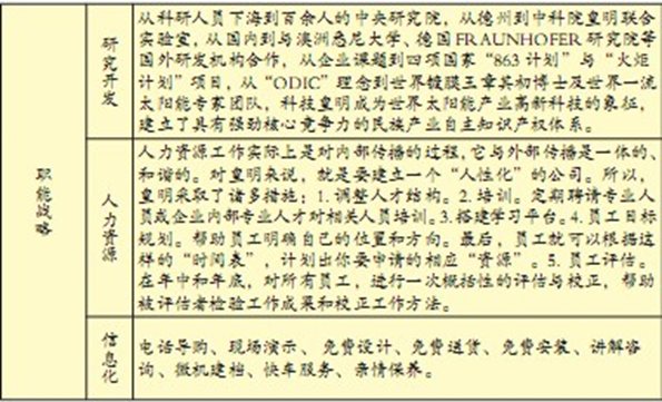 皇明的成功,取决于其长期的、有规划性的公司战略、营销战略、职能战略的确立(如表2-4所示),皇明太阳能中央热水系统已推广几千万平方米,累计节约标准煤1000多万吨,减少相应燃煤污染排放量50多万吨,创造出巨大的经济效益和社会效益。现在全国有太阳能热水器生产厂家近4000家,皇明太阳能集团规模最大、技术能力最强,年产热水器50万台,真空管1200万支,成为中国太阳能行业的第一品牌。2006—2012年皇明全面实施了“太阳谷”计划,再一次实现了从产品到产业的升级。在山东德州,一个占地3000多亩震撼世界太阳能产业谷全面崛起。