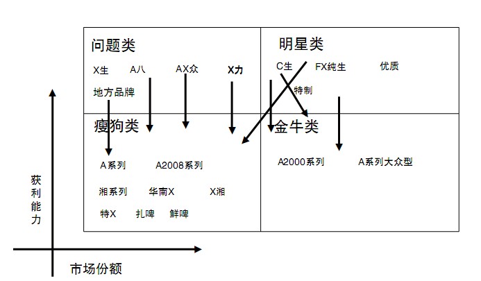 (1) 问题业务。问题业务是指高市场成长率、低相对市场份额的业务。这往往是一个公司的新业务。目前,A啤酒的策略就是将A×生作为形象产品,A×生是 A作为领导品牌技术标准及品质标准的承载者。