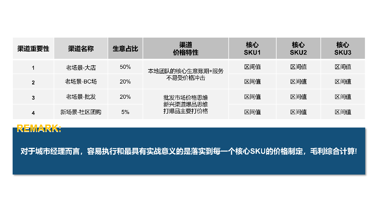 这两个渠道,城市经理要落实到每个核心SKU,综合毛利计算,设计价格区间值。价格的底线是什么,一旦超过底线,城市经理必须管。