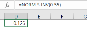 首先有45%的天数卖完巧克力,换言之就是55%没有卖完,这个没有卖完的概率是累积分布。那么计算这个55%对应的Z值,Excel函数能够轻松计算出来为0.126(结果保留三位小数)。