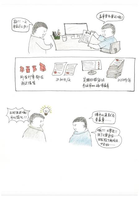 我在为某企业提供流程咨询服务、进行流程调研时,发现用章流程非常复杂,就像漫画中一样。印章管理员向我诉苦,看来苦劳很多,但当我提出要作为试点流程优化时,他拒绝了,因为已经习惯了,不想再改变。