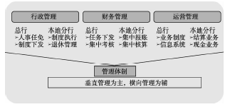 实行“垂直管理为主,横向管理为辅”的管理模式,即由总行直属管理,实施扁平化的垂直管理模式,完成从总、支两级管理制向总、分、支三级管理制转轨。