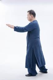 1.双手慢慢放到胸前成按式,同时右实脚随着双手的下降跟着再度松沉,左脚尖维持点地。