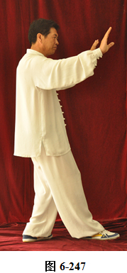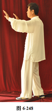 接上式,腰微含,左腿屈膝下垂,左脚向后落步;腰微含,向左转,身体随之左后转,重心落于左腿。右脚尖随身体左转向里转, 腰微拱,重心随之落于右腿,左脚跟随右脚内转向里转。腰下沉, 两腿屈膝,两臂随腰下沉由掌变松拳,拳心朝上。跟着向下划立圆于腹前;腰上提,重心落于右腿。提左膝,腰微含向前蹬出,脚掌心朝外。两臂随腰上提,由松拳变掌向上搂至胸前,随腰微含向前蹬脚时,两臂向左右开,掌心翻转朝外,眼神注视前方(见图6-247至6-250)。