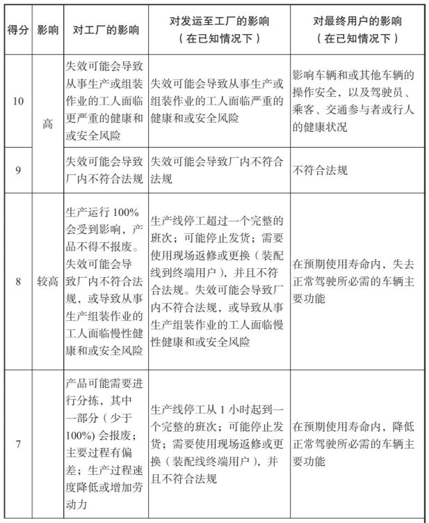 判定准则:后果的严重度级别指当一个潜在失效模式造成了在最终顾客和/或制造/组装工厂的缺陷,应该随时首先考虑到最终顾客。如果在两者都发生缺陷,则采用较高一级的严重度。如表7-1所示。
