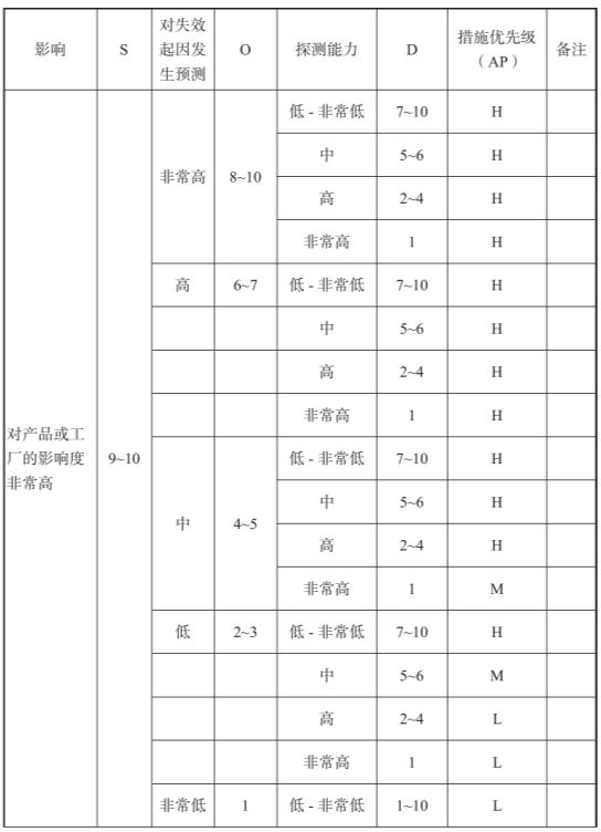 预防控制的有效性:在确定预防控制的有效性时,应考虑预防控制是否为技术措施(依靠机械设备、工具寿命、工具材料等),或应用最佳实践【夹具、工装设计、校准程序、防错确认、定期检修、工作说明、统计流程控制表、过程监控、产品设计等,或行为措施(依靠持有证书或未持有证书的操作人员、技术工人、团队领导等)】。