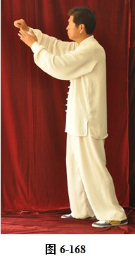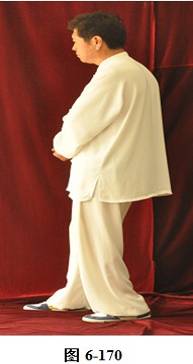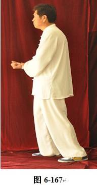 接上式,腰微含,向右外转,重心随腰转落于右腿,两手由捋式变右搬捶,右掌变松拳,左手仍搭在右拳腕部,与右膝成三角。左腰微上提,左脚提起,向前上一步;松腰微拱,向右外平转,上提向左旋转,身体随之缓慢左转。随转体右拳自右肋旁而上向胸前方搬出,随搬随着臂外旋,使拳心慢慢翻转朝上,随即渐渐向左下弧形抽回,左掌也同时随转体弧形向右经右臂里侧前拦,掌心朝右, 眼神观注左掌。腰后拱,重心移于右腿,右拳弧形收回胸前,左掌护住右拳,左掌在前,右拳在左肘里侧(见图6-165至6-173)。腰微含,右膝微屈,身体后倚,右臂拳随身体后倚,略收胸前。腰右外旋转,随转左脚往右里侧内扣,脚尖朝向西北。左臂回拉,向里翻转掌心朝下,重心移落左腿。腰微含,右拳随重心转移左腿变掌, 成左抱球状。