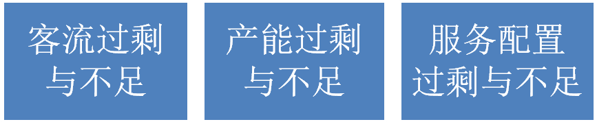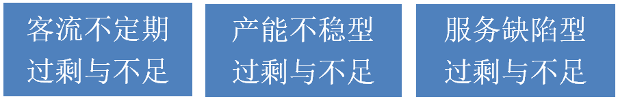 整体性过剩与不足,和客流的过剩与不足、产能的过剩与不足、服务配置的过剩与不足有关系。而结构性的过剩与不足,和客流的不定期过剩与不足、产能不稳定型过剩与不足、服务缺陷型过剩与不足有关系。