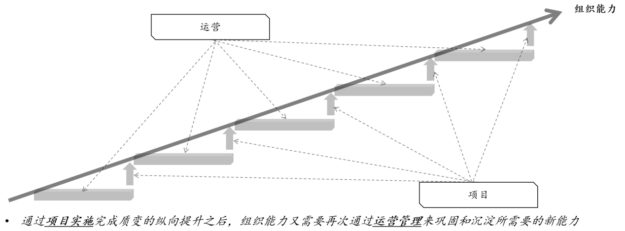在理解“关键任务”之前,我们不妨思考一下:企业战略执行的最大敌人是什么?战略执行的最大敌人是“日常事务”!因此,管理者需要运营管理与项目管理“两手一起抓”,应当重视项目管理工作。为什么项目管理对企业绩效至关重要?项目管理与运营管理的关系是什么?当通过运营管理使组织的发展达到一定程度时,往往很难再以这种方式使组织能力得到更大的提升。在这种情况下,为了突破能力瓶颈的限制组织需要以项目的方式(如组织变革项目、产品研发项目、工艺改进项目)将其能力在垂直方向上提升到一个更高的层次(如图2-63所示)。