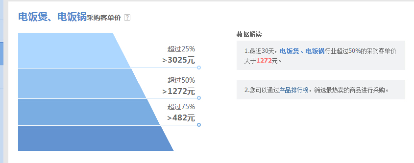 图9-14的采购单价可以让我们看到客户喜欢的价位是多少,以及有多少人喜欢某一价位。我们可以根据这个来给我们的产品定价。我们还可以看出平均一位客户在店铺里消费这类产品的金额大概是多少,依据金额大小,我们可以算出应该生产多少数量的宝贝放到1688大市场上。