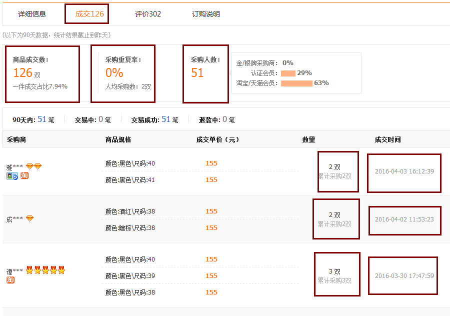 第二步,打开首页的每一款产品,去查看详情页中的成交信息(包括成交数、重复采购率、采购人数、采购数量、成交时间)。记住,一定要详细记录下首页所有竞争对手的这些数据,它的作用有以下几点: