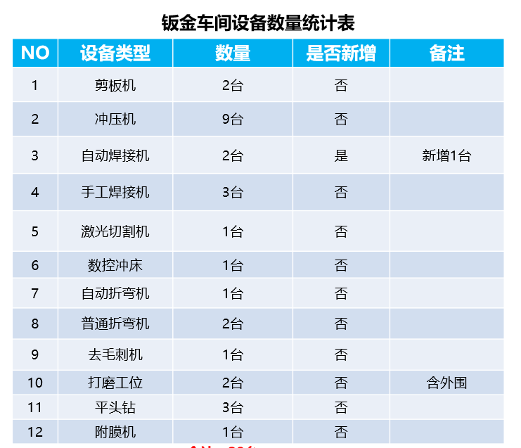 (7)产品工艺对厂房需求:钣金车间目前装有行车4台(含焊接车间小行车1台),物流收发区1台,共5台。