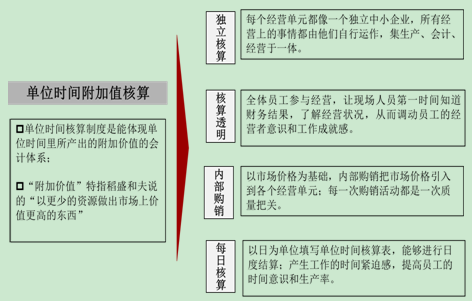单位时间附加值核算的另一个意义体现在为了维持生计,各个经营单元至少要保证单位时间的附加值高于员工每小时的平均工资,因为在计算费用时,劳务费没有计入,而是以总的劳动时间替代。将每小时平均工资和单位时间附加值相比,便可知经营活动中应坚持的底线。