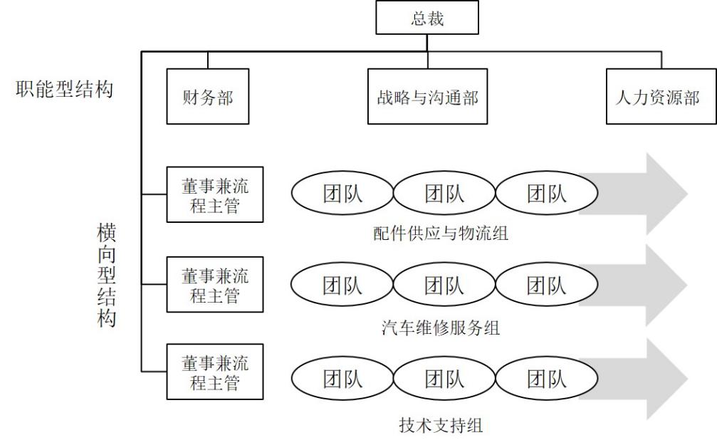 配件供应、汽车维修、技术支持,都采取了流程型组织的设计模式,组建一个个流程团队,面向客户,快速响应。传统的职能组织,作为后台支撑部门,向这些流程团队提供服务。