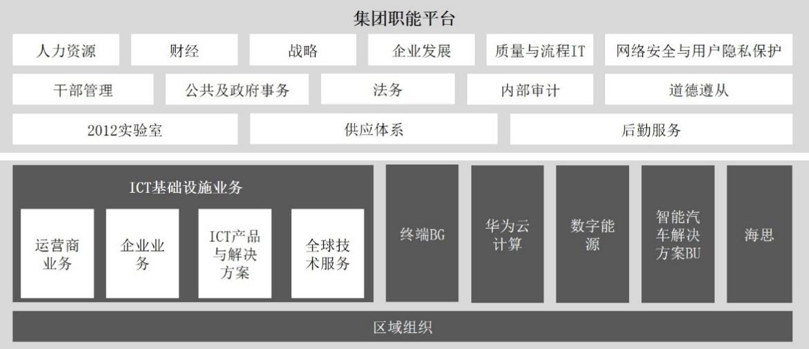 华为公司是流程管理的忠实拥趸,从1998年请IBM授艺开始,流程型组织转型就没有停下过脚步。华为公司目前公布的最新一级组织结构,依然保留了常规的职能结构(形式上),具体的业务运作则基于流程型组织设计的理念做了重构;同时,按照不同产品类做了事业部制管控,如下图所示: