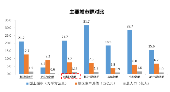 京津冀城市群国土面积21.72万平方公里,占全国的2.25%; 地区生产总值7.7万亿元,占全国的10.35%;常住人口1.15万亿人,占全国的8.31%。京津冀城市群与我国其余两个世界级城市群对比,国土位居首位,人口适中,但地区生产总值最低。这种差距不仅体现在经济总量数据上,区域间城市发展水平不均衡等问题。
