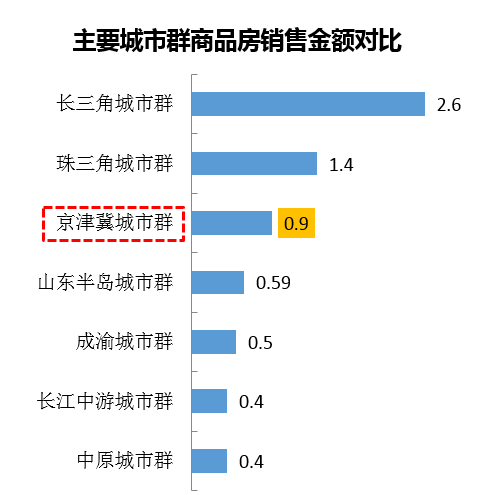 而从商品房销售金额对比来看,京津冀城市群与长三角、珠三角两个城市群相比差距非常大,仅占长三角的1/3,房地产市场成熟度较低。