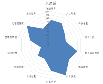 从城市群投资潜力雷达图可以看出,京津冀城市群是国内最具有发展潜力的城市群之一,整体14个维度发展相对均衡。