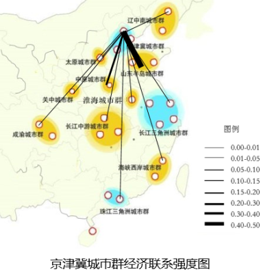 从城市群经济联系强度图可以看出,京津冀城市群和山东半岛城市群联系最为密切,其次与中原城市群联系较为密切。