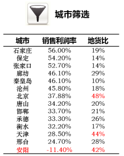 以市场化公司一般选取的投资评审标准作为筛选器,安阳城市平均销售利润率低于15%,应关注市场风险,重点把控好获取土地位置及价格。