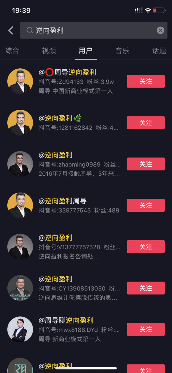 我们来看一下抖音里两位培训讲师的矩阵操作。搜索关键词,可以看到很多账号都和这两位讲师相关,如图3-3所示。笔者点开了几个账号,发现粉丝都是几万、几十万,甚至上百万。这些账号的粉丝,全部加在一起,是非常庞大的数据。这么多账号,每天同时发布同一老师的内容,传播力自然非常惊人,吸引的粉丝也非常精准。