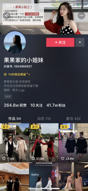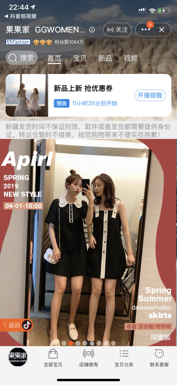 通过抖音矩阵的运营,大量粉丝被引流到淘宝店铺进行转化,果果家淘宝店铺的粉丝关注数量高达1064万(图3-5)。这么多的关注量,实际产生的营销价值大家可想而知。在传统服装店生意艰难的环境下,果果家服饰利用抖音矩阵,成功引流精准粉丝,批量营销,非常值得借鉴学习。