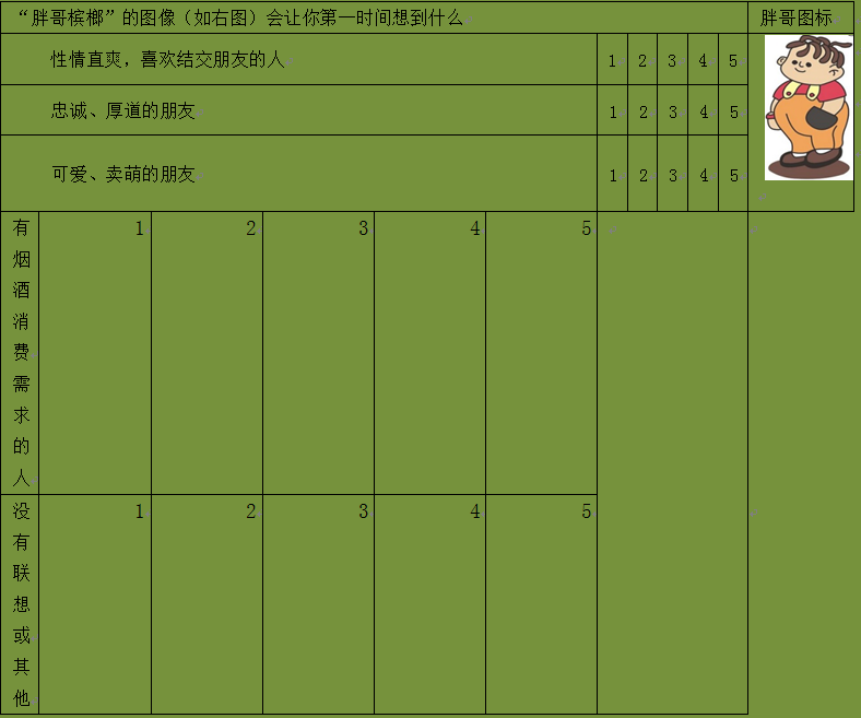 依据这个方法,一步步将涉及胖哥特质的关键词进行测试,根据结果,再将胖哥槟榔消费者认同的形象进行勾勒或者同期比较,形成品牌形象一览表,如图3-1所示。