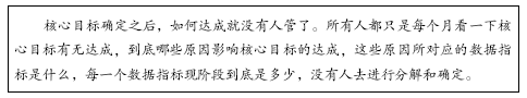 :原来他们确定了核心目标之后,如何达成这个目标就没有人管了。大家都只是每个月看一下核心目标有无达成,到底哪些原因影响核心目标的达成,这些原因所对应的数据指标是什么,每一个数据指标现阶段到底是多少,没有人去进行分解和确定。