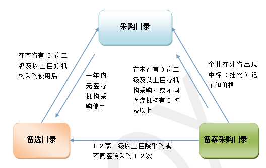 甘肃高值耗材的集中招标首开先河,采取目录的动态调整,采购目录、备选目录、备案目录三者依据产品在医院的使用情况进行互相转化、动态调整,运作更加严格、规范。如图5-1所示。