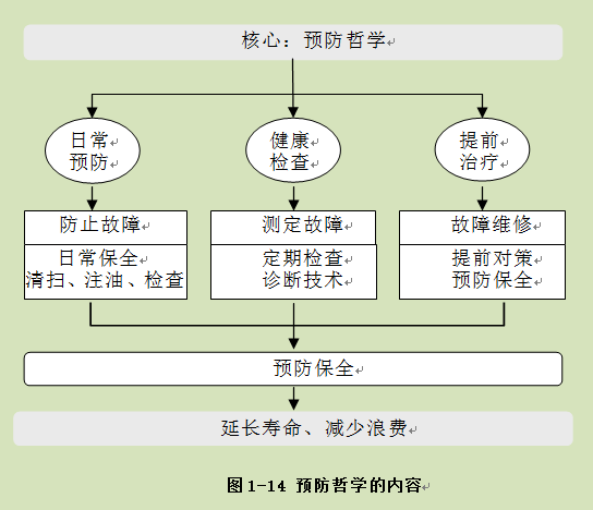 如图1-14所示,预防哲学是全面精益改善的核心思想。在工厂管理中,要做到“预防为主,治疗为辅”,通过确立预防的条件,防患于未然。通过日常预防、定期检查和提前治理,从而排除物理性、化学性缺陷,排除强制劣化,消灭工厂中长期存在的慢性不良问题,延长工厂、设备和工