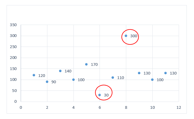 不过,当把这个销售数据转换成图3-9观察,发现其中有2个值是非常值得留意的。图中两个圆圈所圈着的数值,和其他数值相比,比较偏离。从这堆数据来说,这2个值可以视为异常值。