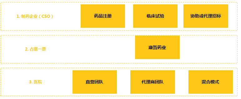 很多医药商业企业转型做CSO后,还是主要从事医药销售工作,做制药企业的代理,为终端配送货物、帮助销售队伍维护终端等。这样的CSO只是对上游制药企业服务的,根本不会为下游商业提供服务。