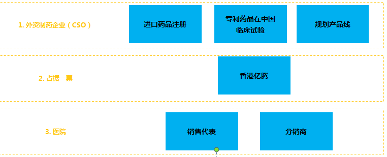 香港亿腾主要从事为国外制药企业代理工作,负责进口药品在中国大陆的注册、专利药品在中国的临床试验,以及为国外制药企业规划在中国的产品线规划。所有的增值服务工作也和康哲药业一样是针对上游企业,对下游,香港亿腾有自己的销售代表和代理商,直接参与下游医药商业的竞争。所以,从这种业务结构可以清晰地看到香港亿腾也不是CSO企业。