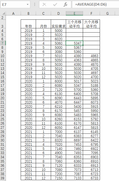 采用过去三个月的历史数据进行移动平均的时候,计算方法和简单平均法一样,选取过去三个月的历史数据并除以期数得出三个月的平均值。当拥有2019年1月到3月的历史数据,通过三期移动平均法计算出1月到3月的平均值,并以此作为4月的预测值。当4月的实际需求值出现后,把它作为新的观测值加入而舍弃最早的观测数据。也就是说,舍弃1月的实际需求值,采用2月到4月的实际值作为计算依据了。