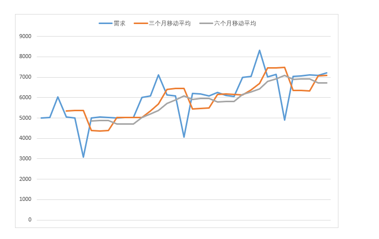 通过图4-7的比较看出,三个月的移动平均比较能反映起伏,而6个月的移动平均,由于期数更多,消除了更多的起伏因素,从而显得变化更加平稳。移动平均法可以通过改变用以平均的周期的长短来调整敏感性,使用少量的数据的平均值得到的预测结果能够快速地响应需求的变化,但有可能变得过于敏感从而受到非典型数据和偶然波动性的影响。