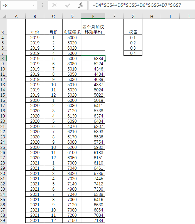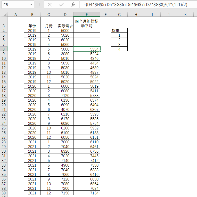 还有一个简便的方法就是直接赋予各期实际需求相应的权重比率,然后根据各自的乘积相加。权重的合计应当为1。